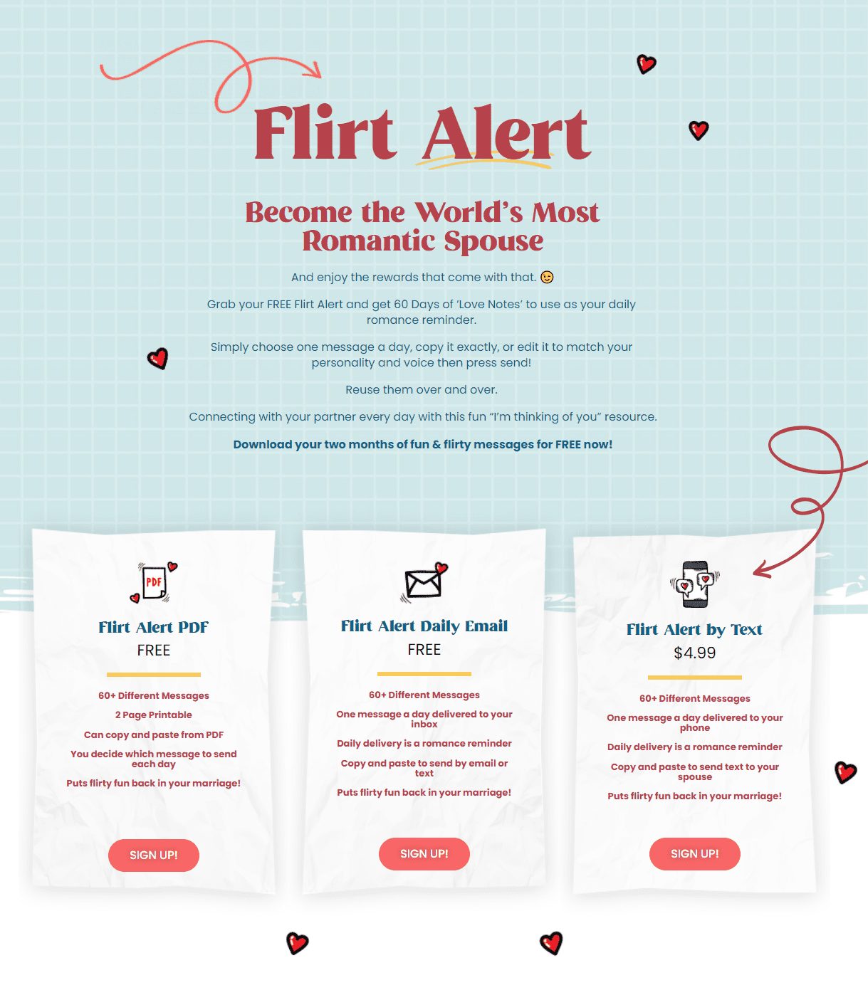 For example, I redid this Flirt Alert landing page to be more visually compelling, instantly understandable, and desirable. It worked, bringing in new email subscribers for an average of $0.74 each.